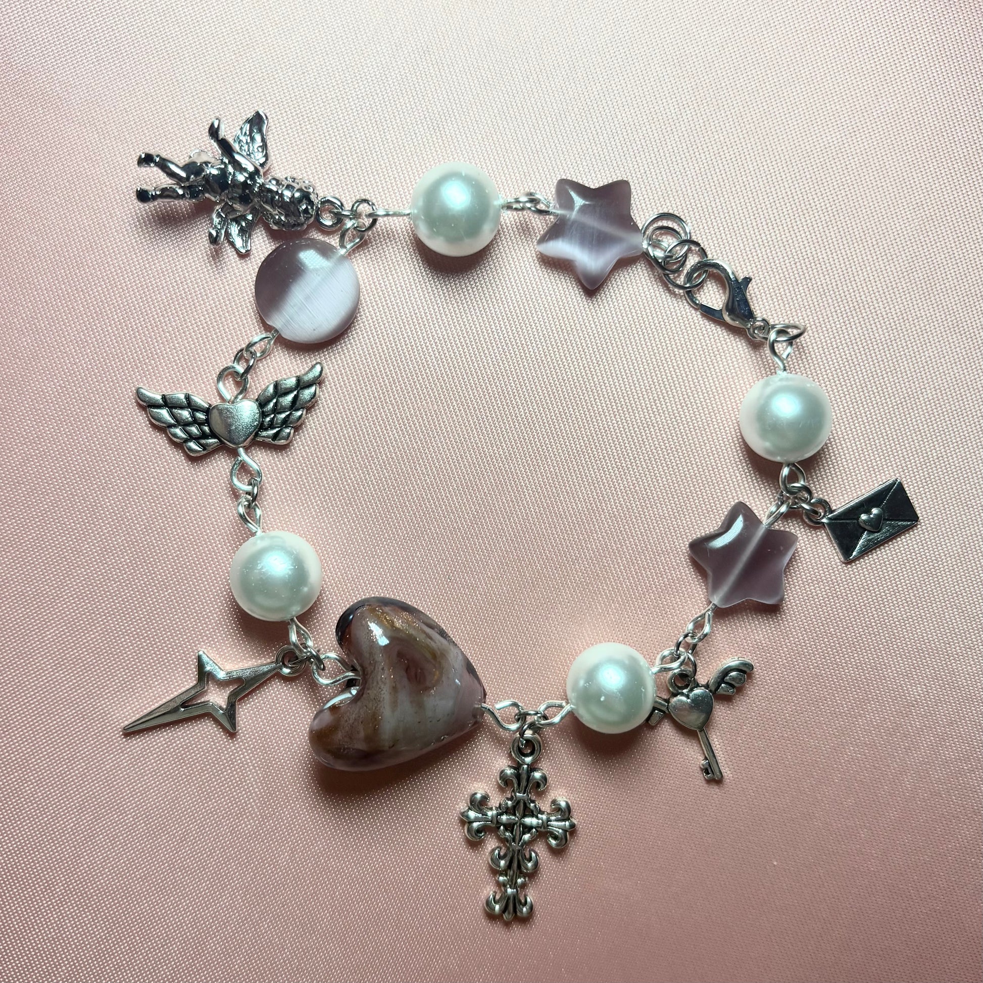 made with glass pearls, cats eye glass beads, lampwork glass heart and zinc alloy charms