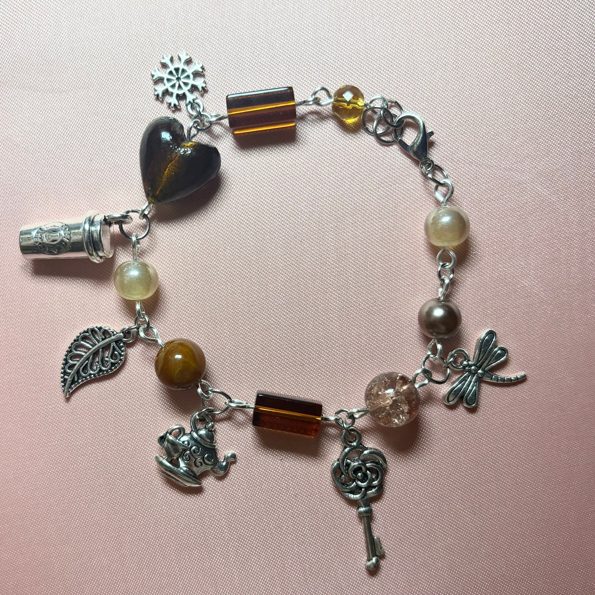 made with glass beads, acrylic beads, lampwork glass heart and zinc alloy charms