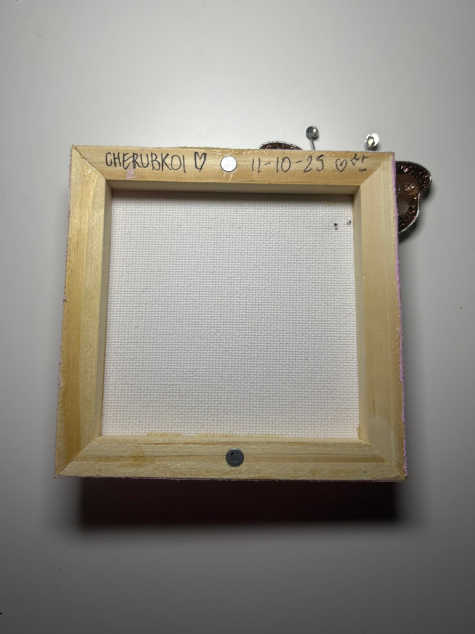 a mixed media piece on canvas measuring approximately 9.5cm x 9.5cm & 1cm depth. can be mounted magnetically
