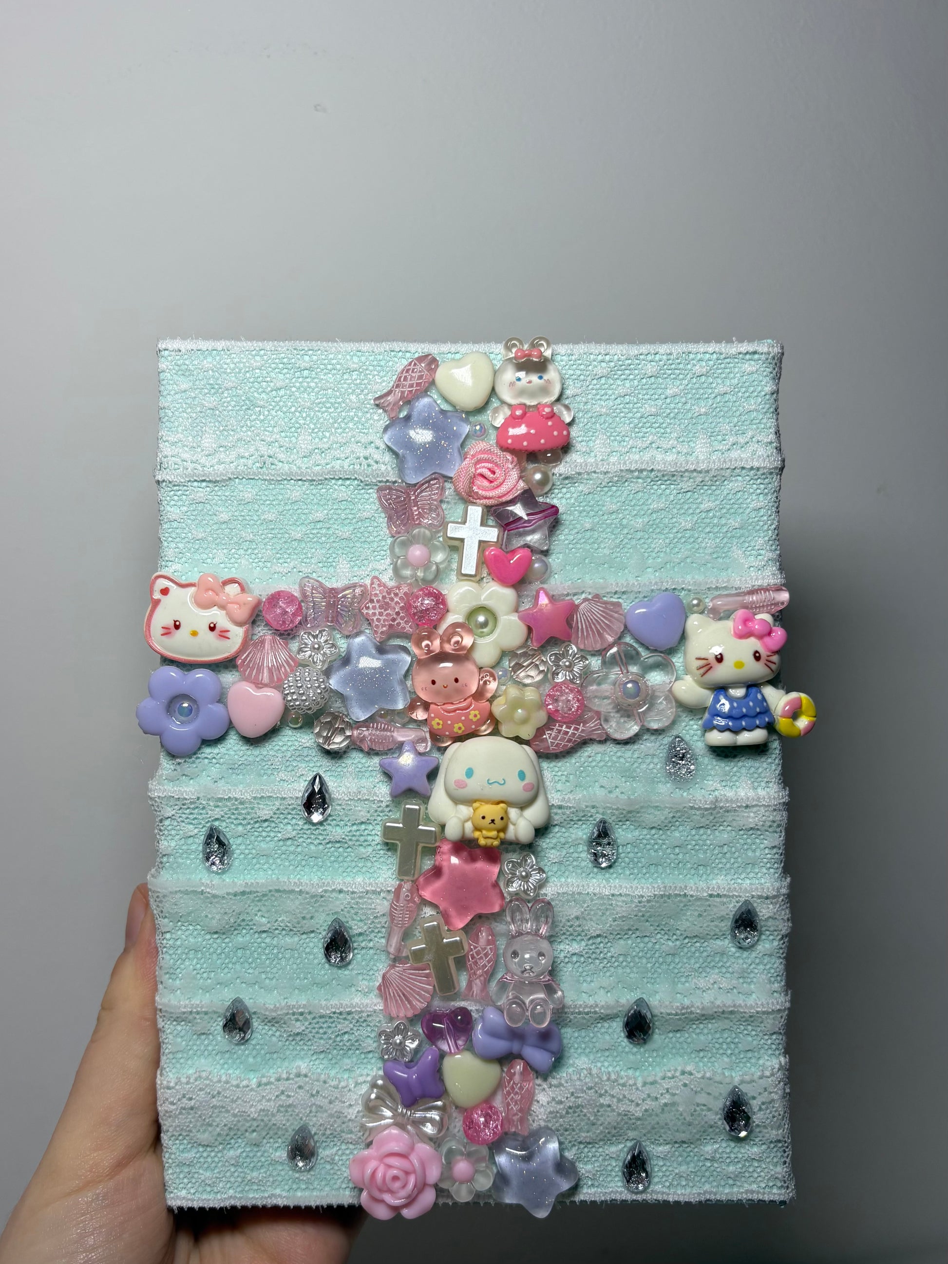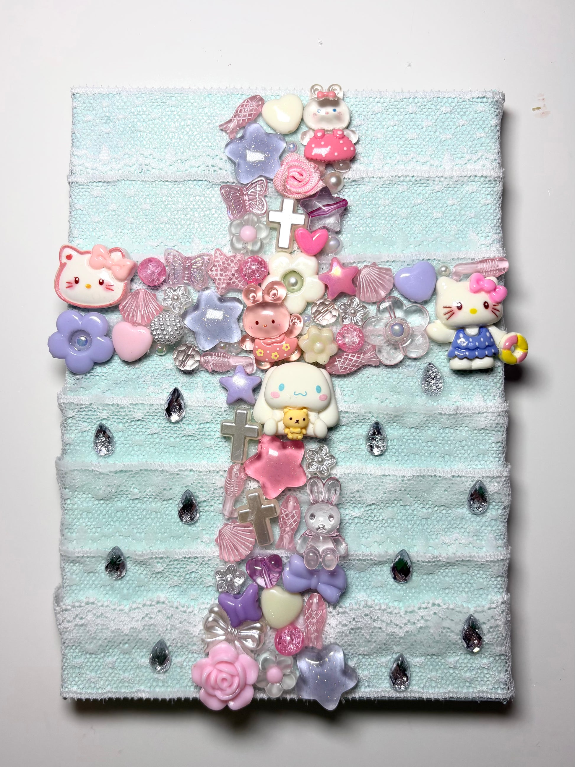 materials include paint, lace, acrylic charms and beads, glass beads and teardrop accents 💕💧🎀